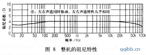 图8为本机阻尼系数特性曲线,在100Hz-20kHz范围内的阻尼系数为4,仅低频端和高频端略有下降。