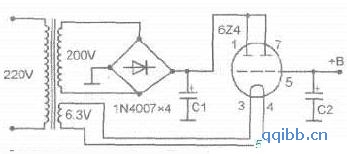 图给出了一个整流滤波电路,该电路中变压器次级高压只有一个线圈,这样在铁芯窗口相等的情况下线径可选粗一点,绕制时也方便简单得多,高压绕组先经过晶体二极管进行桥式整流,这样电容器C1的容量就可增大至数百甚至上千uF,经C1滤波后的直流再经6Z4进行二次整流,这样做的目地是6Z4整流管具有高压延时的作用,可防止对功放管屏极的损坏和省略高压延时起动电路,而且比单纯用晶体二极管整流更具有胆味,电容器C2的容量一般选择200u F以下,由于整个电路中滤波电容有足够的容量并进行了二次整流,这个电路输出的直流电源纹波已经很小了,这对保证整机装好后有一个宁静的背景创造了条件。根据功放电路对电流的不同需求可选择相应的电子管整流管。