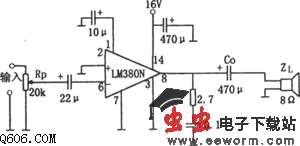 如图为2W音频功率放大电路。该电路采用了14脚封装的LM380作为放大器件,输入信号经音量控制电位器Rp(20kΩ)和22μF的耦合电容加到运放LM380的反相输入端(引脚6),其同相输入端(引脚2)接地,引脚1外接10μF的滤波电容,以滤除高频纹波干扰,电路采用16V单电源供电,并在电源端(引脚14)到地之间外接470μF的去耦电容,其输出端(引脚8)到地之间有两个并联支路:一支由2.7Ω电阻与0.1μF电容串联组成,用于提高电路的稳定性,滤除部分高频,防止产生高频自激振荡;另一支由470μF的耦合电容Co和负载ZL(8Ω喇叭)组成,Co和ZL决定了电路的下限截止频率fL。由图中的参数可得出其下限截止频率为: