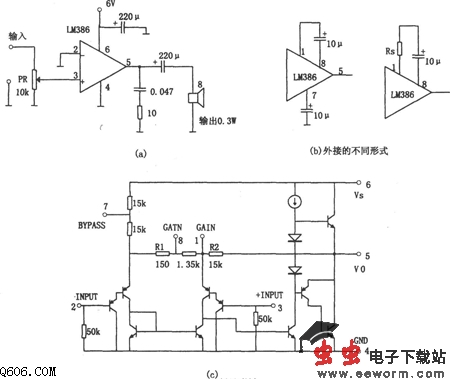 电路如图所示为通用型音频功率放大电路。图(a)是原理图,该电路采用了集成功率放大器LM386,该器件为通用型功放,且价格低廉。图(c)是LM386的内部结构图。