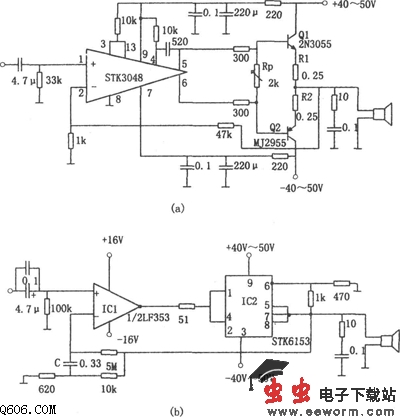 图(b)所示电路的前置放大采用LF353集成运放,该运放为场效应管输入型双运放,后级采用厚膜功放集成块STK6153。该功放块采用全互补对称结构,转换速率快、精度高、噪声低、功率大,由于其内部使用恒流源偏置,故工作稳定可靠,其外壳散热器与内部电路绝缘,使用非常方便,图示电源电压为±(40~50)V,必要时可采用电容去耦电路,以降低电源的纹波干扰,电路增益可通过适当改变负反馈支路的电阻加以调整。