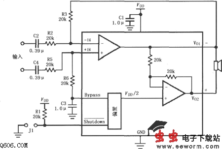 如图所示电路为LM4902差分输入音频放大电路。音频信号以差分的形式输入到+IN端和-IN端。