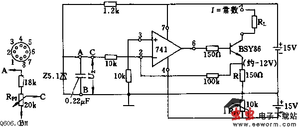 运算放大器输入端A、B、C三点所围部分可用电位器RP1代替,此时BSY86的发射极电位可通过RP2调整到对地-0.6V,电位器滑动触点对稳压管正端电位为-12V,于是电阻R和电位器RP1可以取消。