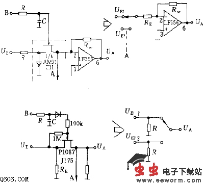采用模拟电子开关取代有接点开关,可以防止产生火花和射频干扰,上图为采用结型场效应晶体管和运算放大器的电路极其等效的机械线路。输入信号Ue(或Ue1、Ue2……)在B端有控制信号(高电平10V)时结型场效应晶体管导通,通过运算放大器产生输出信号Ua(反相位)。下图示出类似的电路。