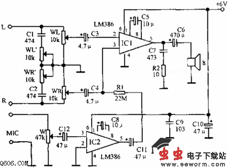 本电路可以把立体声中的歌唱声去掉,仅留下伴奏音乐。立体声信号中的歌曲从IC1(LM386)的2(反相输入端)脚、3(同相输入端)脚以相同电平信号输入,则信号会在LM386中互相抵消,没有输出,而伴奏音乐以立体声形式分别由2、3脚输入,因左右声道电平有差别不会互相抵消。本电路的电压增益为40~46dB(约相当于100~200倍)。话筒信号经IC2放大后加到IC1的同相输入端,经IC1放大和伴奏音乐同时由扬声器放出声音。