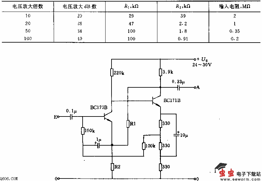 采用两级直接耦合从而减少元件,又由于采用从第二级射极至第一级基极和第二级集电极至第一级射极,这样两极直流负反馈,故使工作点非常稳定;与供电电压、环境温度等几乎完全无关。图表为几种参考数据例。