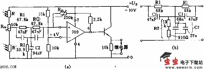 该电路采用光敏电阻作为敏感元件,调节电位器的阻值可以适应不同类型的光敏电阻。电位器滑动触点与运算放大器同相输入端之间接入双T型电路(图b),其两个电阻均为R1,两个电容均为C1,另一个电阻R2的阻值为R1的一半,电容C2为C1容量的两倍,则对于零频率(最高衰减频率)为f0=1/2帕R1C1