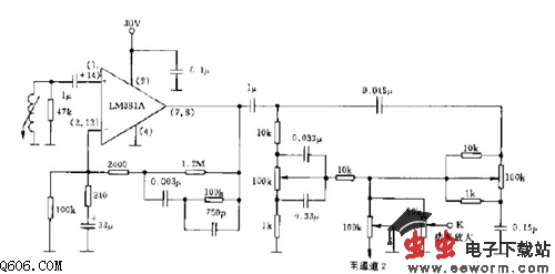 图中所示,采用LM381A的前置放大器电路。LM381A是双前置放大器集成电路。当要求有最佳噪音性能时用来增强低电平信号。器件中的两组放大器是完全独立的,这里仅使用一组。内有电源去耦的稳压器,可供给120dB的电源电压变动抑制比和60dB的通道分离度。LM381A可工作在9~40V宽电源电压范围内。