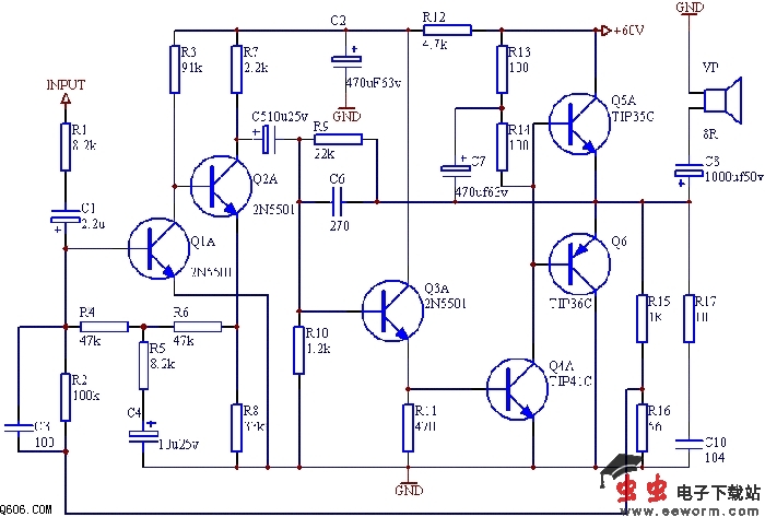 由于功放级处于乙类状态,仅在有信号时才有功耗,所以功放管的散热片可适当小一些。又由于省去了发射极电阻,因而减小了对电源的消耗,使功放管能够获得更高的工作电压。