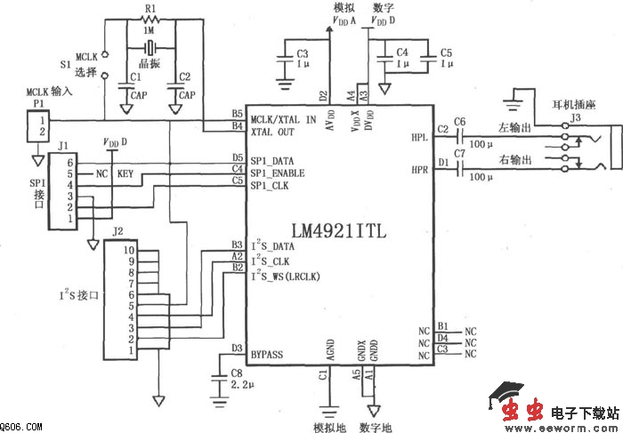 如图所示为LM4921用于双声道耳机放大器的典型电路。由SPI接口总线J1输入控制线信号:串行数据信号SPI- DATA,串行使能信号SPI-ENABLE,串行时钟信号SPI-CLK。由I2S接口总线J2输入全范围的串行数字音频信号:I2S数据信号I2S-DATA,I2S时钟信号I2S-CLK。I2S字选信号I2S-WS(又称Right/Left Select)。由P1输入MCLK信号:当S1断开时选择外部主时钟MCLK输入;当 S1短接时选择内部晶振(11.2896MHz)。立体声耳机输出由J3输出,采用100μF电容作为隔直流电容,以防止输出直流电流损坏耳机。LM4921的模拟电源与数字电源分别独立。