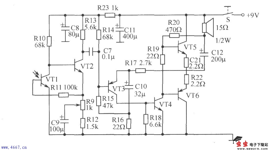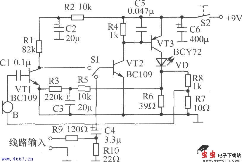 激光音频发射机的电路图工作原理:激光音频发射机的电原理图见下图。这是一个三级直接耦合放大电路,VT1、VT2为两级音频信号电压放大器,VT3为音频功率放大器,激光发射二极管VD串接在VT3的集电极电路中,它的工作状态始终与功率管VT3的工作状态保持一致。音频信号设有两种输入方式:一种是话筒B将声音转换成电信号,经C1耦合送人VT1的基极;另一种是将“随身听”或其他音源引出的音频信号接在线路输入端,由R9、R10分压后,经C4耦合到VT2的基极。图中,C2、R2、C6组成电源退耦电路,防止出现低频自激。
