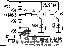 电路如附图所示。锂电池充电完成后的端电压约为4.2V,经VDl、VD2和VD3分压后逐点送入两只三极管Vl和V2。由于分压值不相同,两只LED的驱动电压也不同,随着电源电压的降低而降低。当电源电压为4.2V时,两只。