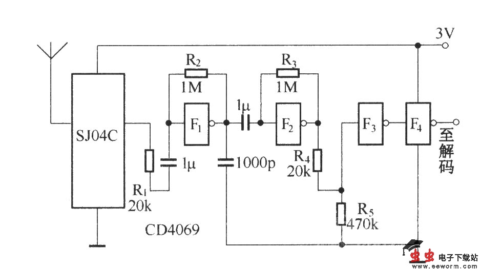 SJ04C内部不包含放大与整形电路,输出的信号要加以放大,整形后才能到***解码.放大整形电路如图所示.