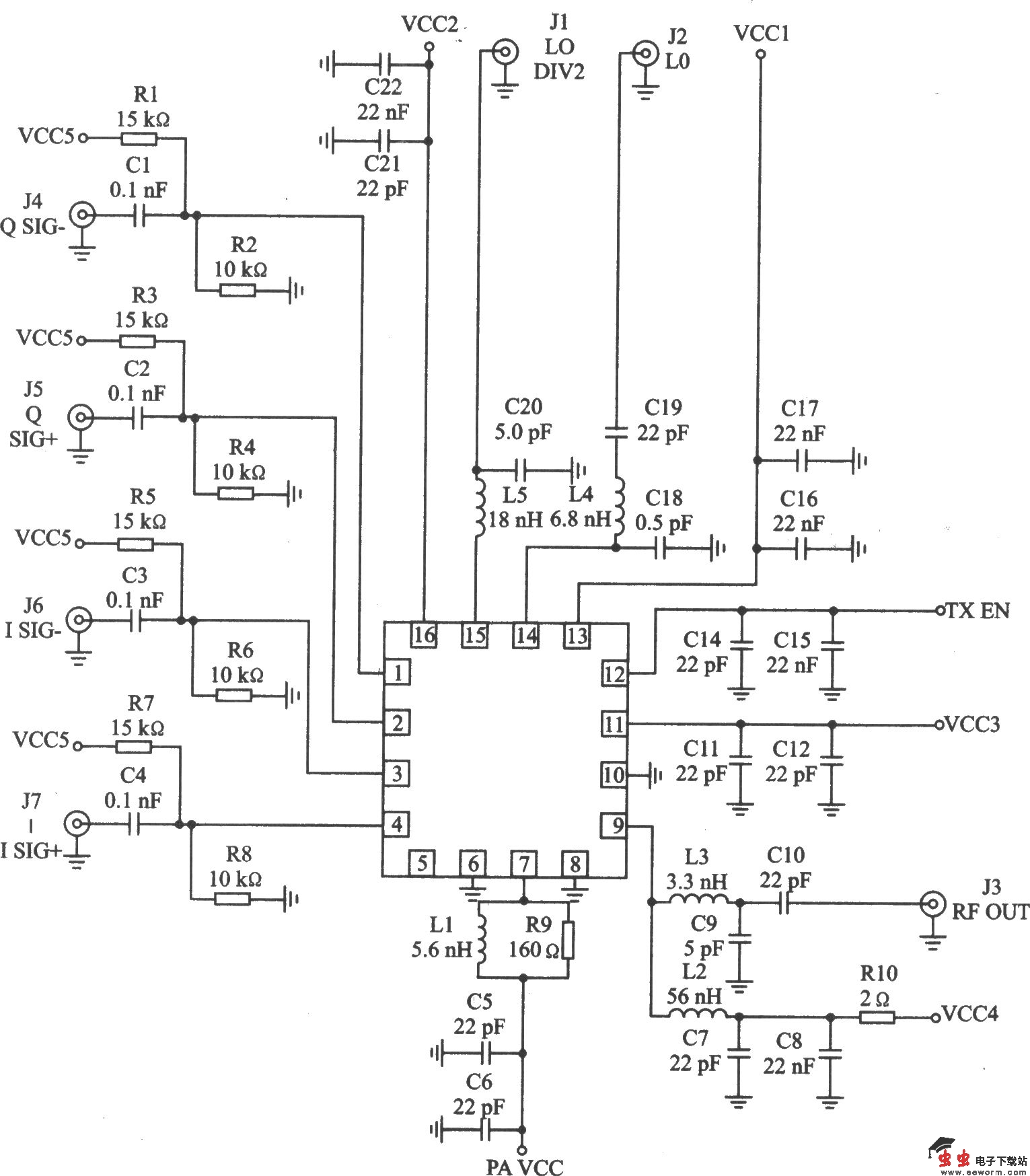 RF2942是一个具有正交调制器和功率放大器的发射器,可应用于915 MH ISM将RF产品、数字通信和便携式移动设备中。 主要技术特点如下: l ·工作频率为902--928 MHz: ·工作电压为2.0~3.6 V。 ·工作电流为l70~260 mA,待机电流为l0~24 mA: ·输出功率为200 mW; ·本机振荡频率两倍于RF频率,以避免外部合成器的干扰; ·本地振荡器的正交相位利用集成电路内部的无源网络产生; ·正交调制器由一个单端的本机振荡器(LO)驱动。