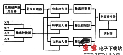 DZ-2型治疗仪的方框图如图47-1所示,由低频超声波发生器、射极跟随器、输出控制器、功率放大器、调制器及电源等组成,可以分三路输出(电针用),也可单路输出(治疗用)。