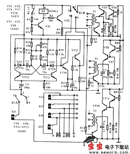 DZ-2型治疗仪的电路原理如图47-2所示。低频超声波发生器、功率放大器、输出调节的工作过程与DZ-1型相同。不同之处是在低频超声信号发生器与功率放大器之间加了一级射极跟随器,以提高带负载能力,供三路输出。调制器是由晶体管VT12和VT13组成的无稳态多谐振荡器,由VT13集电极输出。一路直接输出矩形波,一路经VT14及VT15射极跟随器形成起伏波进行调制。S1A与S1B联动,当S1处于“1”位时,整机断路不工作;当S1处于“2”位时,电源接通,连续超声波直接输出无调制;当S1处于“3”位时,超声波矩形波调制,呈间歇输出;当S1位于“4”位时,为起伏波调制,调制频率在12~42次/分之间,由RP4调整。VT1、VT2、VT4、VT7、VT10均为3AX31型管;VT3、VT5、VT9均为3AX63型管;VT6、VT8、VT11~VT15均为3AX81型管。