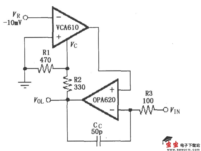 如图所示为驱动VCA610增益的控制脚产生一个温度补偿对数响应的反馈放大电路。VCA610提供具有低失调电压和低增益漂移的250kHz(-3dB)对数(Log)放大,在温度控制方面,VCA610的指数增益控制特性允许产生简单的温度补偿对数运算响应。