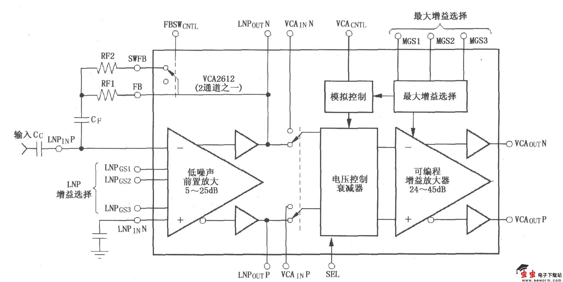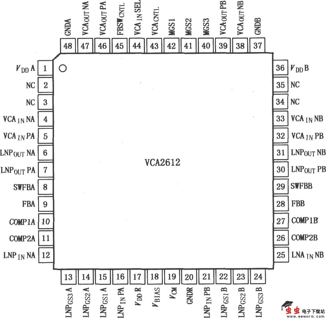 VCA2612/2613/2616是高集成度、双接收通道的信号处理系统,每个通道由双低噪声前置放大器(LNP)和可变增益放大器(VGA)组成。LNP提供必要的连接实现有效终端(AT),其低阻抗输入使得电缆终端的噪声数值改善了4.6dB,终端数值可以改变以适应不同的信号源。差分电缆终端特性可利用LNP切换反馈脚来实现。LNP可以接收两个差分输入和单端输入信号,并产生差分输出信号,可提供5dB、17dB、22dB、25dB的固定增益。LNP能够为外部信号的进一步处理提供通道,或直接反馈到VGA。VGA包含电压控制的衰减器(VCA)和可变增益放大器(PGA)两部分。PGA的增益范围数字可编程,使用者只要通过外部连接,就可以实现增益范围从0dB到电特性参数表中的最大值(MGS设定)。VGA输出既可以差分模式也可以单端模式来驱动高性能的模/数变换器。VCA2612/2613/2616有着低窜扰和显著的低失真特性,具有低噪声和增益范围可编程特性,可用于对于噪声要求严格的许多通用性模块。VCA2612/2613/2616采用TQFP-48封装,其引脚排列如图所示。