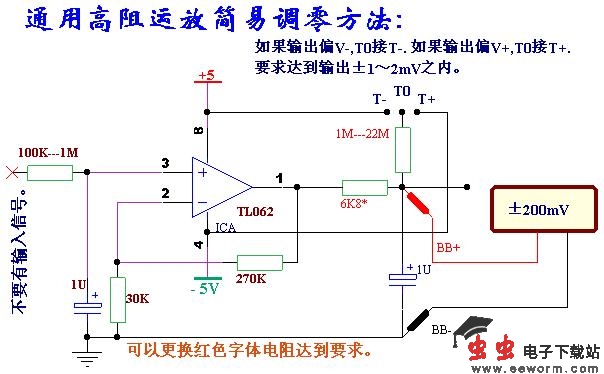 这里出示的通用运放简易调零方法,可以方便达到输入信号为零时,输出零点偏差在 1 ~ 2mV 之内。如果需要更加小的零点输出,就需要把红色字体 6K8 的固定电阻更换成为微调电阻,否则会不容易选择到合适的配置电阻数值。
