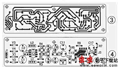 图3为印刷电路板图,图4为元件布置图。具体安装时,可将此电路板安装在功放箱中靠近背面的附近。通孔,并经过J2(双信号插座)接音源。
