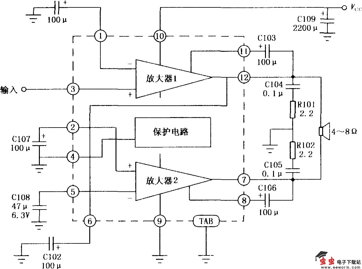 HA1388是音频功率放大集成电路,采用12脚单列直插塑料封装结构。该电路在电源电压13.2V、 4Ω负载阻抗和10%失真时,输出功率为l8W,并且不用输出耦合电容。电路内设有过压和热切断保护电路,外接元件也较少,适用于汽车收音机中作音频功率放大器。如图所示为HA1388的内部电路框图及其典型应用电路。