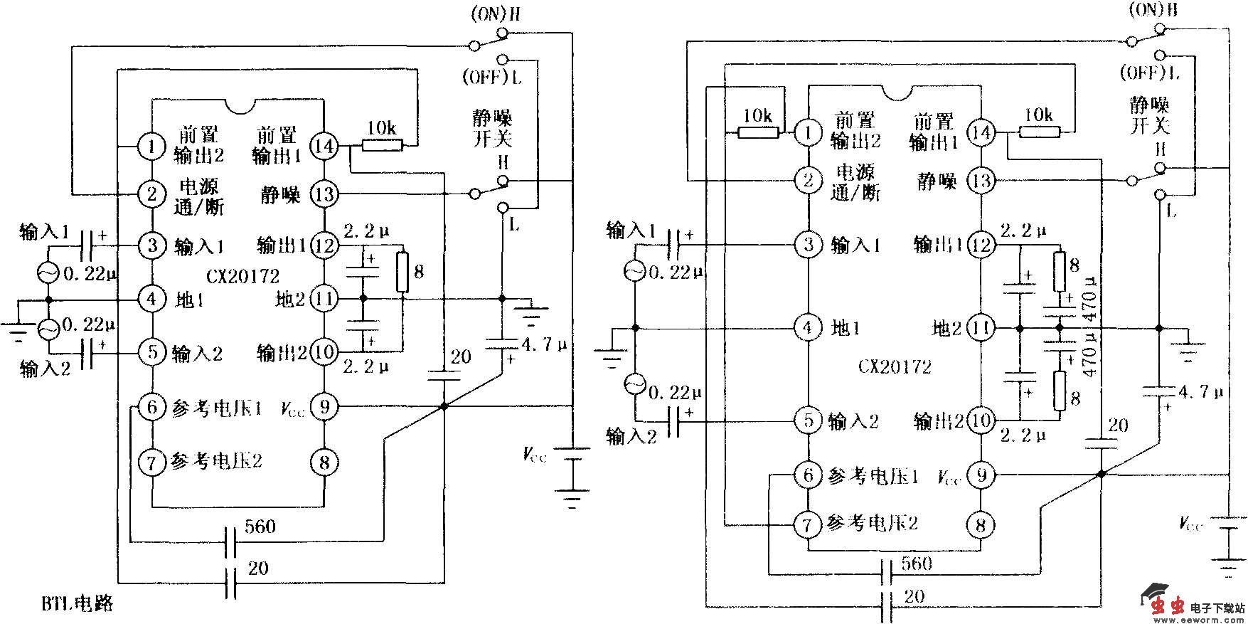 CX20172采用14脚双列扁平封装,工作电源电压范围为0.9~2.2V。在Vcc=1.5V、RL=8Ω、THD=10%时双声道工作,每声道输出功率为20mW,BTL连接时输出功率为80mW。电路内还设有静噪、电源通断功能。CX20172的最大电源电压Vcc=4.5V,允许功耗PD=560mW(TA=25℃)。如图所示为CX20172的典型应用电路。