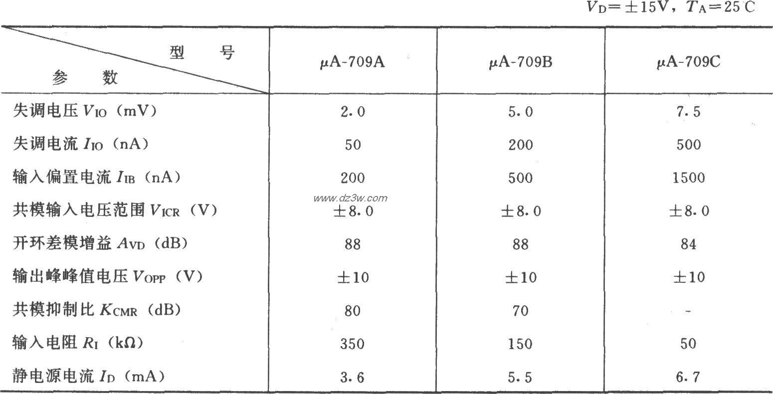 如图所示为μA709构成的可变增益差动放大电路。该电路的最大优点是在保持共模抑制比KCMR不变的前提下,可实现差动增益连续可调。电路中四个电阻R2和两个电阻R1的阻值必须分别相等,图中给出了典型应用时的数值。调整电位器R3,可实现连续调整电压放大倍数。若增益调整电阻R3调到5Ω,则相应的比值R2/R3=104,此时电压放大倍数Av=-104×(2R2/R1),显然该电路增益的调整范围很宽,而且调整方便。但需要强调指出:电压增益不能过大,因为当其增益大到Vo接近电源电压时,输出电压将出现严重的非线性失真。另外,在引脚1、8之间引入了RC补偿支路,在引脚5、6之间也引入了补偿电容C2,用以提高电路的稳定性,防止产生寄生振荡。该电路的基本关系为:Vo=-(2R2/R1)·(1 R2/R3)·(Vi1-Vi2)Av=Vo/(Vi1一Vi2)=-(2R2/R1)·(1 R2/R3)当R1=10kΩ,R2=50kΩ,R3=5kΩ时,Av=-110。μA709集成芯片的电参数(VD=±15V,TA=25℃)