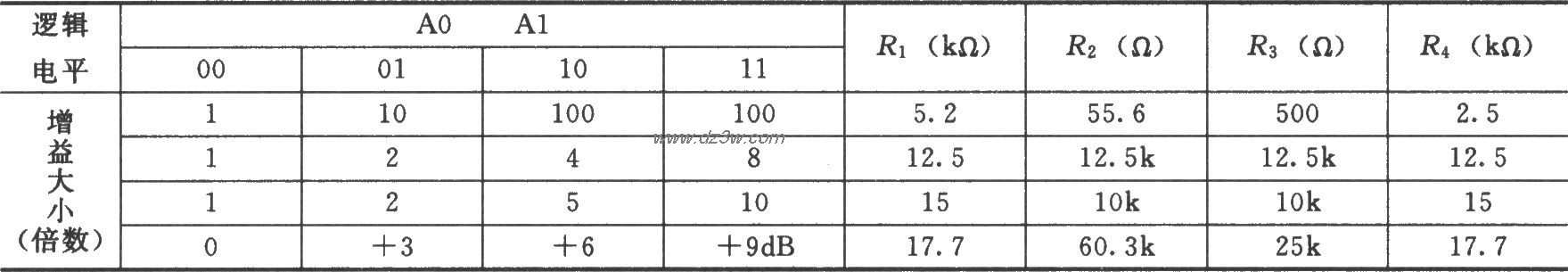 由多路模拟开关HI-509与INA115构成的开关增益放大电路可提供不同的增益,如图所示。lNA115是低成本的普通仪用放大器,不需要外接失调电路就可获得很高精度。开关增益放大电路由多路模拟开关HI-509与INA115所构成。图中,R1~R4为增益电阻,通过计算与选择不同的增益电阻,就可获得不同挡位的增益大小。其计算公式为:A=1 50kΩ/RG,其中A为增益,RG为增益电阻。模拟开关的控制由A0和A1逻辑电平决定,下表列出了不同的逻辑电平和不同的电阻所得到的不同增益。