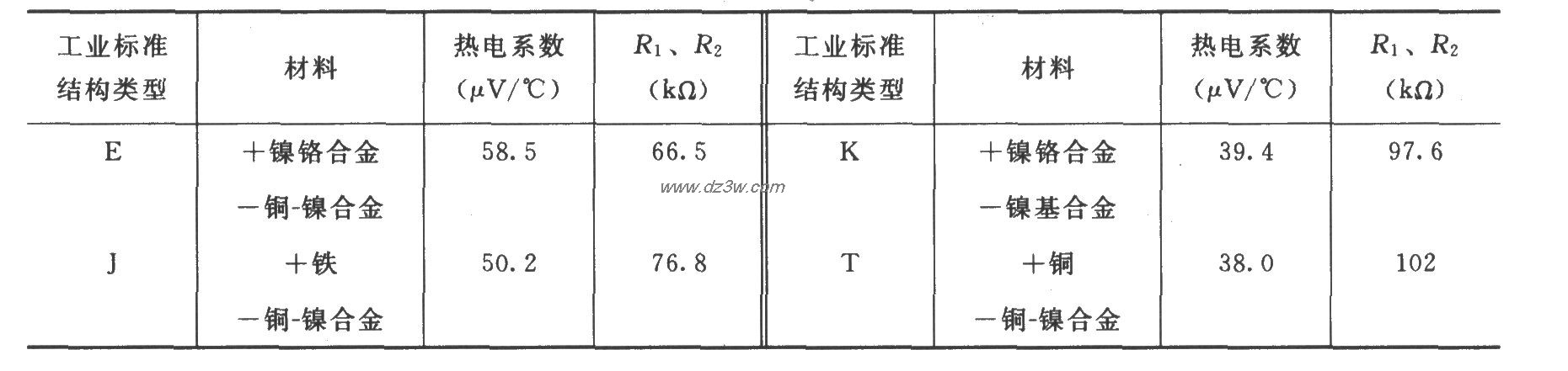 如图所示为由INA141构成具有冷端补偿的热电偶放大电路。采用REF102精密基准电源对热电偶提供工作电压,热电偶产生的电压由INA114放大后输出。热电偶为K型,选用其他类型热电偶时电阻的取值见下表。
