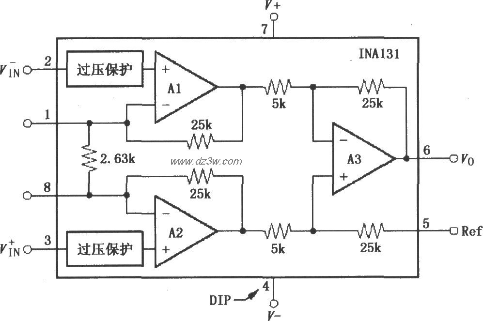 INA131 INA131是低价格精密通用型仪表放大器,内部采用通用的3个运放和小尺寸设计。INA131激光校正电阻精确设定增益为100,内部输入保护使其能够经受±40V电压而不会损坏。INA131采用8脚塑封DIP,SOL-16表面封装,其引脚排列如图所示。