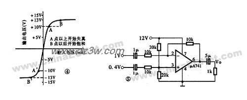 (2)图5是单电源差分放大器。若输入电压为50Hz交流电压,V1=1V,V2=O.4V,它的输出电压该是多少呢?