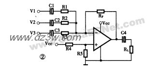 图2是一种单电源加法运算放大器。该电路输出电压Vo=一RF(V1/Rl十V2/R2十V3/R3),若R1=R2=R3=RF,则Vo=一(V1十V2十V3)。需要说明的是,采用单电源供电是要付出一定代价的。它是个甲类放大器,在无信号输入时,损耗较大。
