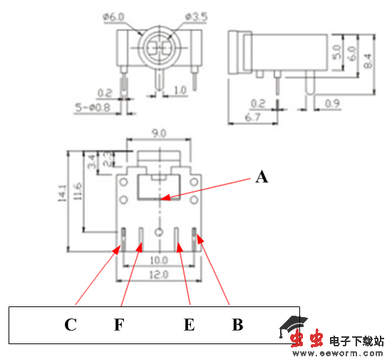 常开型音频插座 插头插入时, E,F触点闭合。 B,C 为左右声道。B点对应 耳机插头 中段,C点对应耳机端头, A 对地。