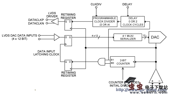 MAX19692的数据时钟输出再由数据输入锁存时钟进行2分频或4分频。然后数据在双倍数据率(DDR)模式下在时钟的两个跳变沿进行锁存,或者在四倍数据率(QDR)模式下在时钟的每90°相位处进行锁存。如果多个DAC的数据时钟延迟相匹配,或数据时钟相互之间反相,那么锁存时钟相匹配。