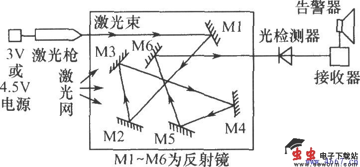 本文提供的是用3V或4.5V电压供电的小型激光枪,由于其激光束很细,传送距离较远,人眼又看不见,因此可用来组成高效的、交叉的防盗光束网,探测有无盗贼闯入。如图是激光防盗系统示意图,它由发射器和接收器两部分组成。从发射器发出的激光束经6只反射镜M1~M6来回反射后送至接收器,接收器中的光检测器只要有激光束照射,就会呈低电阻,引起VT导通,VT的集电极为低电位,这时晶闸管因触发极无触发电流而不导通。如有人闯入激光束探测网区域内,激光束就会被隔断,光检测器呈高电阻,晶体管VT截止,其集电极为高电位,使SCR晶闸管触发导通。继电器RL吸合,其触点闭合,使报警器发出报警。如要终止报警,只要断开一下复位开关S即可。激光束的投射距离视激光强度而定,用4.5V供电的激光枪总射束距离不少于800m;用3V的激光枪约为500m。M1-M6为反射镜。
