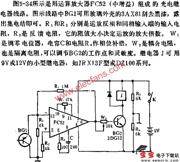 调整时,接通电源,无光照时,运放输出高电平,BG2导通,继电器吸合.如果继电器不吸合,可调节W2.然后用手电筒照BG1的集电结,使C,E间值减小,然后调节W1,使运放输出端为低电平,BG2截止,继电器释放.该电路既可用于工业自动控制,也可用于游艺会上的光电靶等.