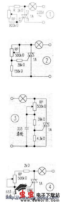 而在过零处关断。它是靠改变可控硅的导通角来调光的。图1、2、3、4都是随机型调光电路。