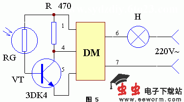 该装置应用电路工作原理如图5。在白天,由于光照较强,光敏电阻RG的内阻很小,此时有较大电流通过RG而使三极管VT饱和导通,VT饱和后,控制器DM的④端电压远低于1.6V,故DM内部截止,照明灯H不能点亮。