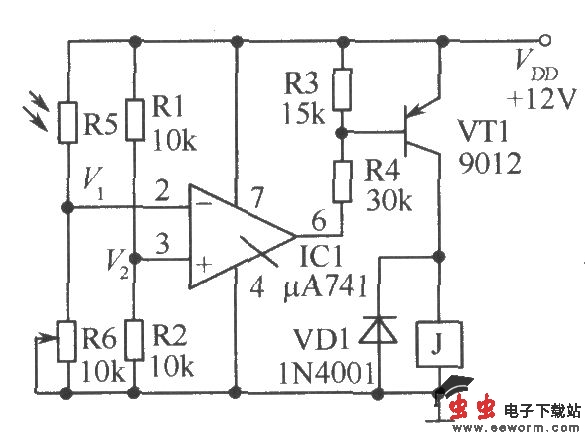 如图所示的电路为一种精密光亮光控电路,其工作不受电源电压及环境温度的影响。电阻R1、R2、R6及光敏电阻R5共同构成惠斯顿电桥的两个桥臂。