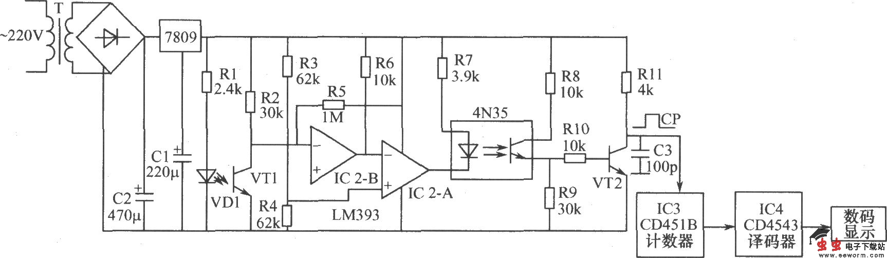 如图所示电路,当光敏三极管VT1接收到红外发光二极管射来的红外光线时,VT1导通,比较器IC2-B的反相输入端6脚为低电平,7脚输出高电平,加到比较器IC2-A的反相输入端,使1脚输出低电平,则光电耦合器4N35内的发光管点亮,对应的光敏管导通,三极管VT2也导通,VT2集电极输出低电平。当有物体通过红外发光二极管VD1和接收管VT1之间,红外线被挡住,VT1截止,IC2-A的1脚输出高电平,4N35截止,VT2截止,VT2集电极输出高电平,故当有物体通过VT1时,便在VT2集电极上输出计数脉冲信号,该信号送到十进制计数器,再送到译码显示电路,显示出相应的数据。 光电计数电路