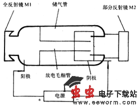 氦氖激光器的结构见图54-1所示。其工作物质(即发光物质)在激励系统(即能源)的作用下,实现某些能级间的粒子数反转分布,以完成原子(或分子、离子)的受激辐射,并通过激光器中的谐振腔,以实现其对光波的放大,从而得到传播方向相同、相位一致、频率单一而能量高度集中的激光。