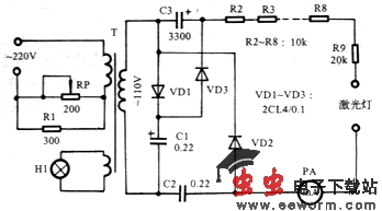 激光医疗器的电路原理如图54-2所示。电源变压器B的次级110V电压,经C1、C2、C3、VD1、VD2、VD3组成的四倍压(瞬时峰压)电路整流,得到4kV以上的直流高压,激励触发氦氖激光管。