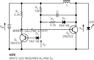 乍一看,IAVE与VIN的关系极大。但是,仔细研究对数项后发现,只要适当选择VB,对数项就是VIN的锐降函数。因此,对数项可以完全补偿公式中的VIN2项。这种补偿正是二极管D1与Q1基极串联的目的所在。该电路可驱动高亮度的黄色LED或白色LED。表1示出了为这两种颜色LED选用的合适元件。表1还示出了在VIN=1.35V时的某些测量结果。因为在逆转期间白色LED两端的电压从3.9V下降到3.1V,所以电容器C会从基极可得到的电流总量中吸收电流。这种吸收作用也许会在电感器L中的电流降低到零之前重新触发电路。增加R3和 D2可解决这个问题。在逆转期间,流过R3的电流可补偿电容器C吸收的电流。