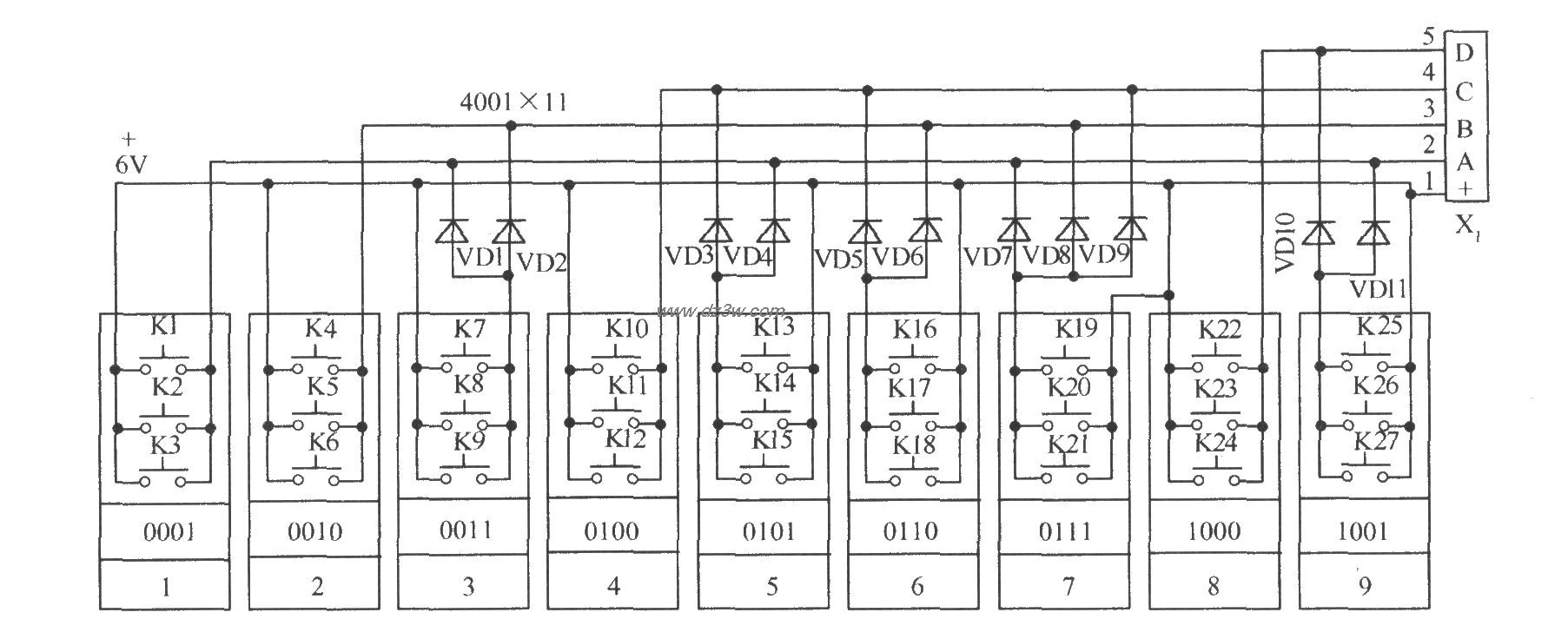 如图所示为病房病员报讯显示器其声光终端安装在护士值班室。显示为一位数,以每间三病床合用一号,则接纳27位病人受控报讯,可满足一般小医院病房区使用。该电路仅用2片常用微功耗CMOS电路IC1(4511)和IC2(4001),另加一片“叮咚”门铃片IC3(KD-153)。不仅成本低,且等待状态时功耗仅数微安,可直接用5号电池6V接入,亦可不必设电源开关,使用者不用担心电网停电事故。报闹显示时虽有100mA的耗电,但每次触发仅约8s,故4节5号电池可持续使用半年时间。工作原理:Xl插座输入ABC04线作为译码器IC1(4511)二进制输入码,平时无信号输入时地址码为0。因无信号触发单稳电路,故译码器IC1输出处于高阻状态。当输入数字1~9时,高电平脉冲触发IC2A与IC2B两门构成的单稳电路,输出脉宽为8s的延时脉冲,使IC3叮咚门铃片发出约6声“叮咚”声。同时使IC1之4脚升为“1”电平并启动IC2C与IC2D两门组成的低频振荡器对显示进行调制,让译码显示数字产生间断闪烁的醒目效果。R4与R5比例构成调制脉冲占空比,即显/熄比例;R7与C11、C12决定每次触发后的单稳延时时间,KO为显“0”检查键。下图将X1插头5线引出线作为地址码总线,把二进制码串入二极管接各病房号开关引线,各室同时并上3个开关,以满足同室三床位使用。