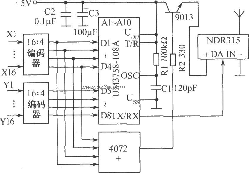 该电路的核心芯片为UM3758-108A,它是一块收发两用单片编解码集成芯片,引脚T/R接高电平为编码发送,接低电平为接收译码。选用它是因为恰好有8位数据线,可一次完成编码传送。数据经UM3758并一串转换后再由无线发射模块NDR315发射出去。为降低功耗,当未发射激光或未打中靶时,无线发射模块无电不工作;故将编码后的4行(或列)信号送人一4输入或门,只要击中靶面,行或列均至少有一位为高电平(第一行,第一列不设光敏管),或门的输出端就为高电平,使三极管9014饱和导通,无线发射模块得电工作。(3)接收电路