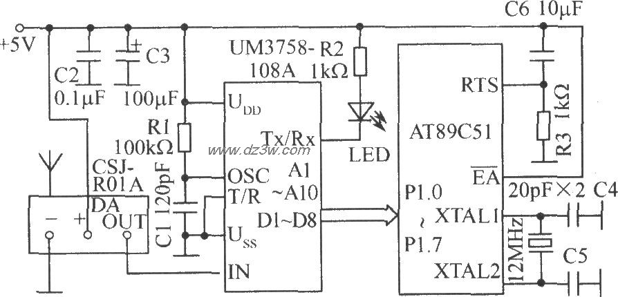 CIS-ROIA为无线接收模块,UM3758-108A的T/R为低电平,工作于接收模式,将CJS-RO1A收到的串行数据译码还原为8位并行数据,送入单片机处理,由单片机转化成显示数据送出去显示。