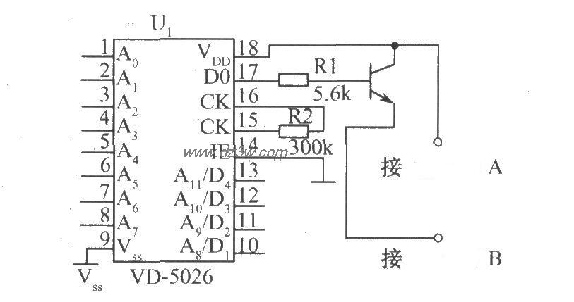 该电路由编码器VD5026和激光电筒构成,其中A1~A11为地址线,其逻辑状态可以为1、0或悬空,不同的地址线组合可以在输出端D0得到不同的脉冲串,去调制激光电筒的发射,即通过激光可传送上万组不同的编码数据。编码接收电路: