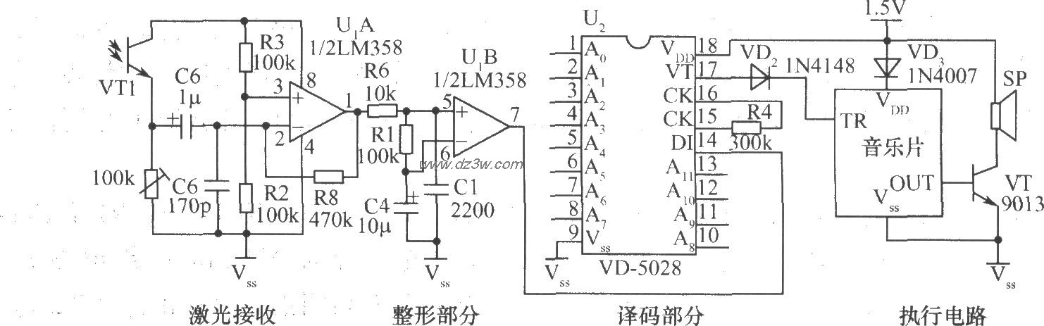 该接收由光电器件、运放LM358组成的放大、整形电路组成,将接收到的信号送入VD5028的输入端DI进行译码(VD5028的A1~A11与VD5026的状态须一致),译码正确时,在VT端输出低电平,去触发后面的控制执行电路发出声响。