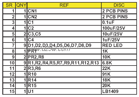 由9个LED组成的音频电平表电路,AudioVUmeter9leds Specifications5LEDVUMeterkitisbasedonLB1409ICfromSANYO,whichwillindicatesthevolumeleveloftheaudiosignalitsensesSUPPLY12VDC@50mAPR1REFSETPR2AUDIOLEVELSETSchematic PartsList