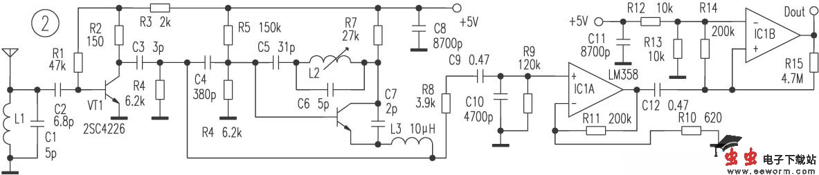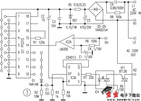 图2、图3分别为高频接收和译码控制电路。图2中天线接收到的信号经VT1高频放大之后进入VT2进行选频,选出与发射器载波频率相同的信号,进入IC1A放大,放大后的信号进入IC1B整形后由Dout输出至图3的Din,再经过IC2A的进一步滤波整形送入PT2272的脚。PT2272是与PT2262配套使用的译码集成电路,它也有8位3态地址引脚,只有与PT2262的地址引脚设置相同时,才能正确译出数据信号,在PT2272的对应输出端输出高电平。D1、R2、R3、C1组成消除按键抖动的电路,以保证遥控操作的可靠性。D1的正端可以接在PT2272的脚至脚之任一处,它们分别与发射器的4个按键对应。C2和R4完成对CD4013的预置,使初次加电时CD4013的输出端为低电平,即受控电器处于断电状态。IC4为带过零触发功能的光电耦合器,当CD4013输出高电平时,光耦工作,同时触发双向可控硅导通,在输出端输出220V电压。采用可控硅作为开关控制可以消除采用继电器产生的噪音,同时整个电路的可靠性也得以提高。接收部分电路的供电采用阻容降压方式,实现了整个电路的小型化。